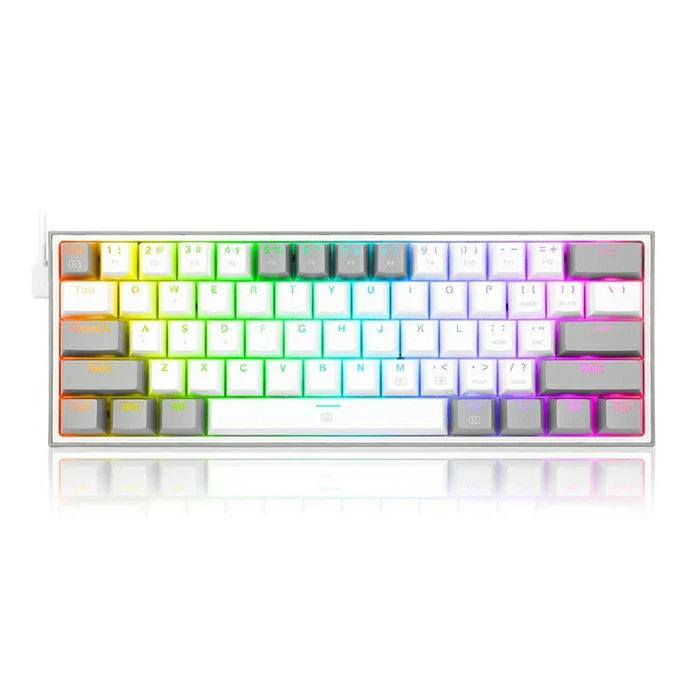 کیبورد گیمینگ ردراگون مدل K617 FIZZ سفید طوسی از نوع 60 درصدی است؛ یعنی طراحی جمعوجور و مینیمال داشته و فضای کمتری روی میز اشغال میکند. این ویژگی باعث میشود فضای بیشتری برای حرکت موس داشته باشید و میز کار یا گیمینگ شما مرتبتر به نظر برسد.